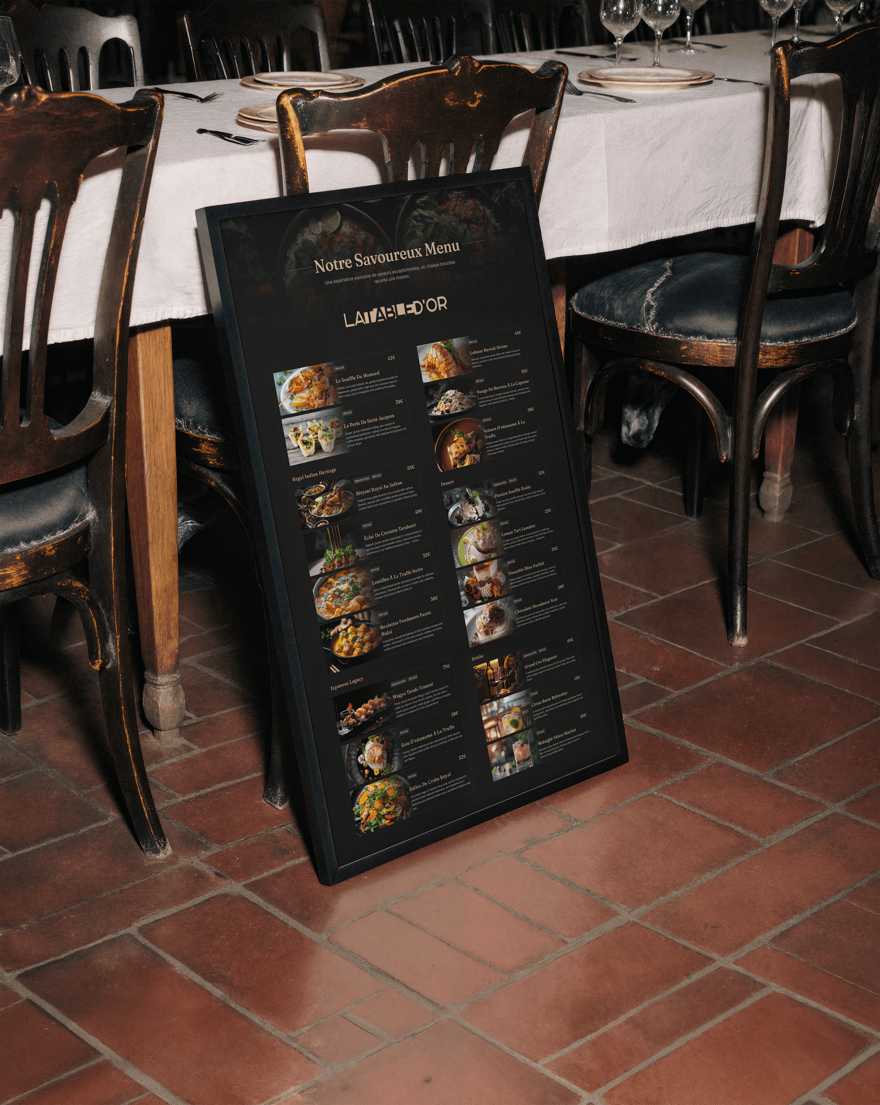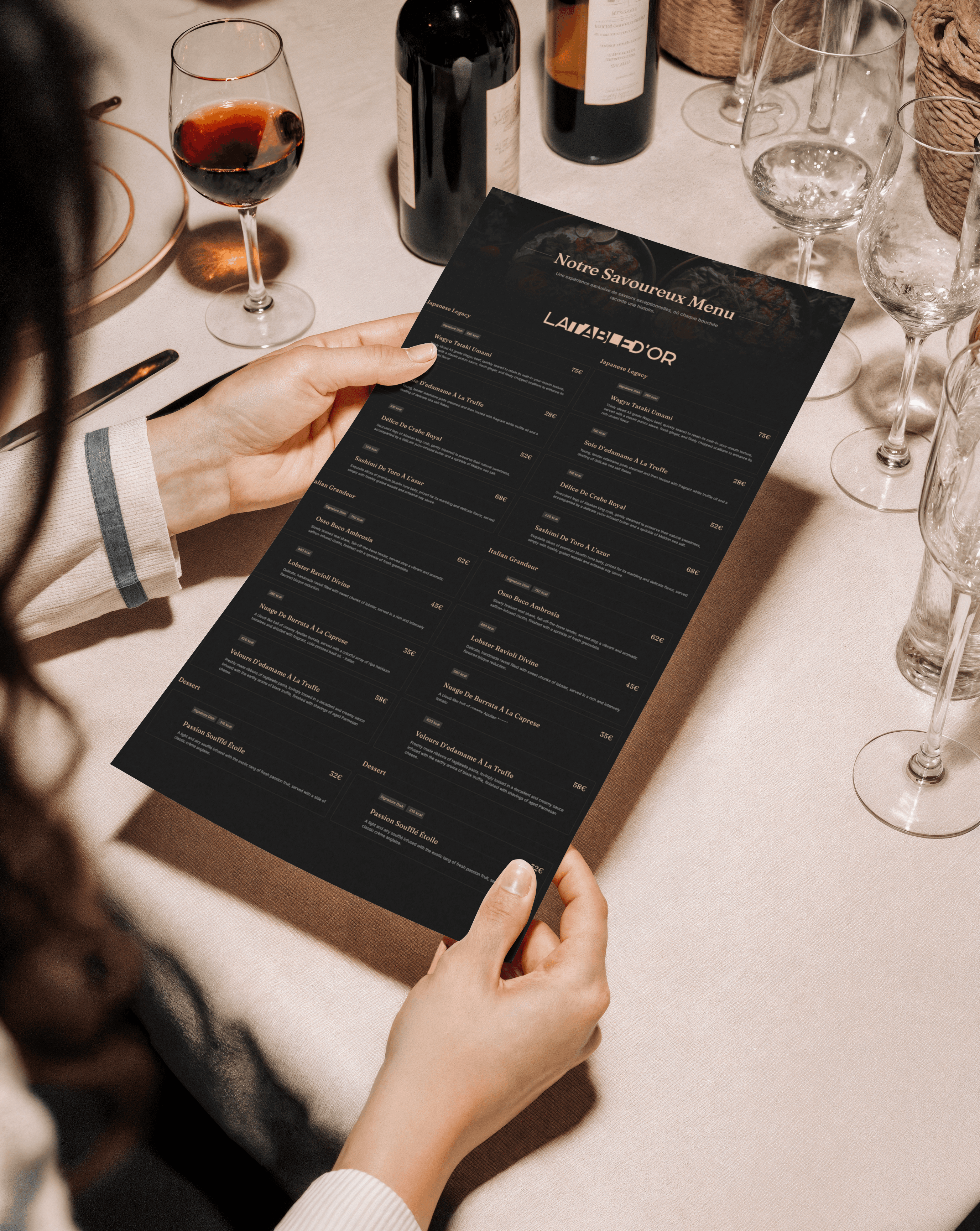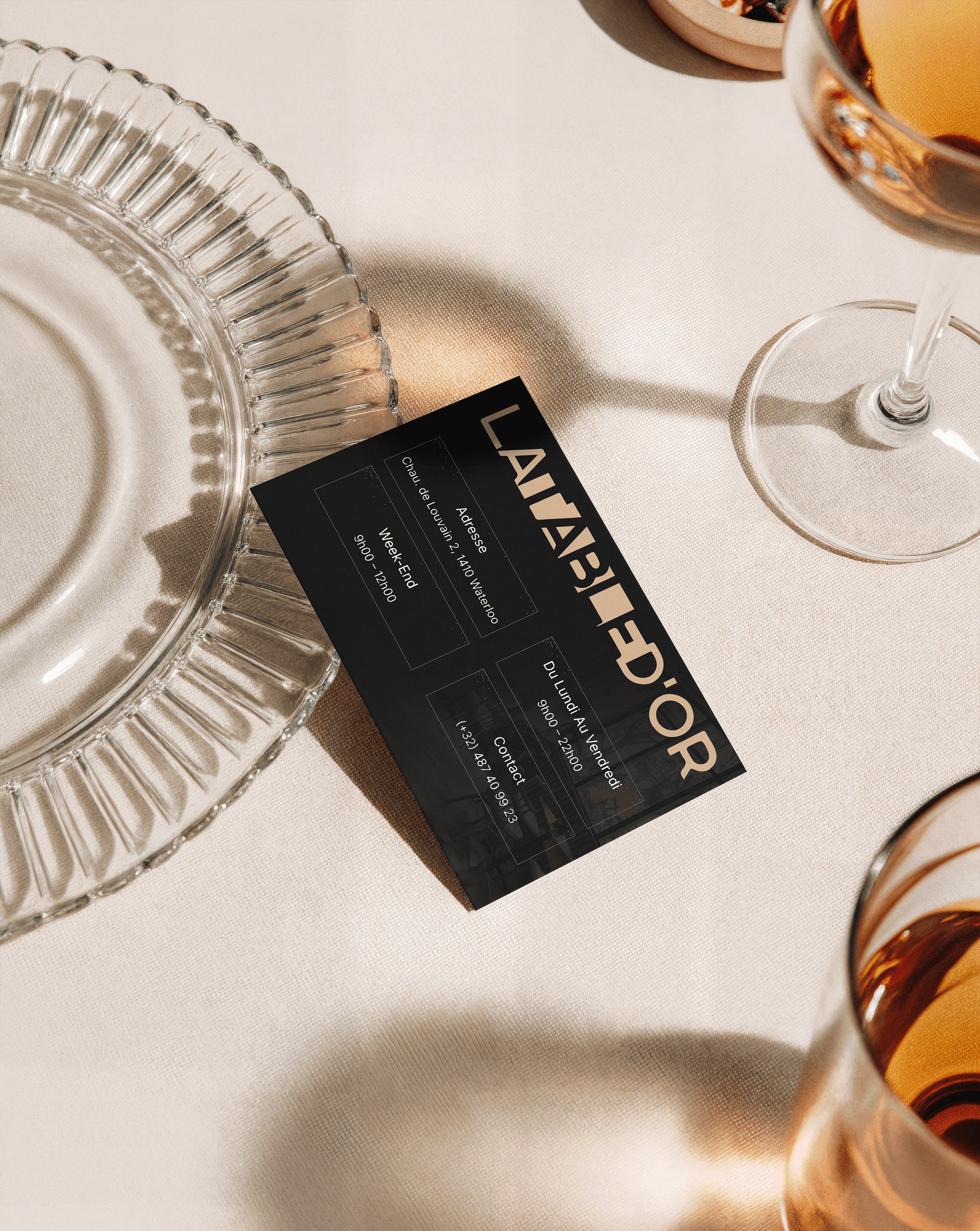 Ce travail de branding vise à créer une expérience cohérente et mémorable pour les clients de La Table d’Or, en traduisant l’univers du luxe culinaire dans chaque détail visuel.