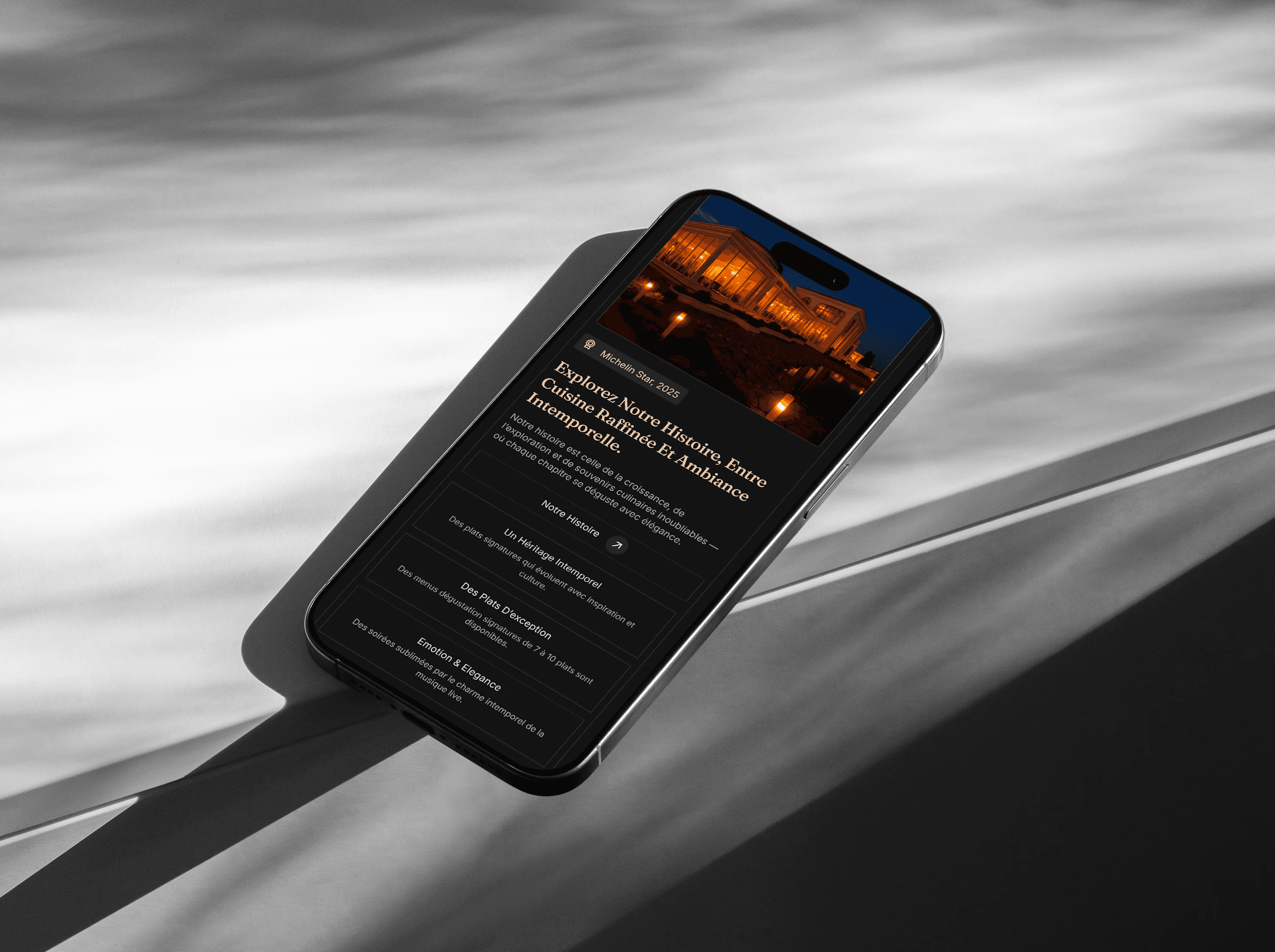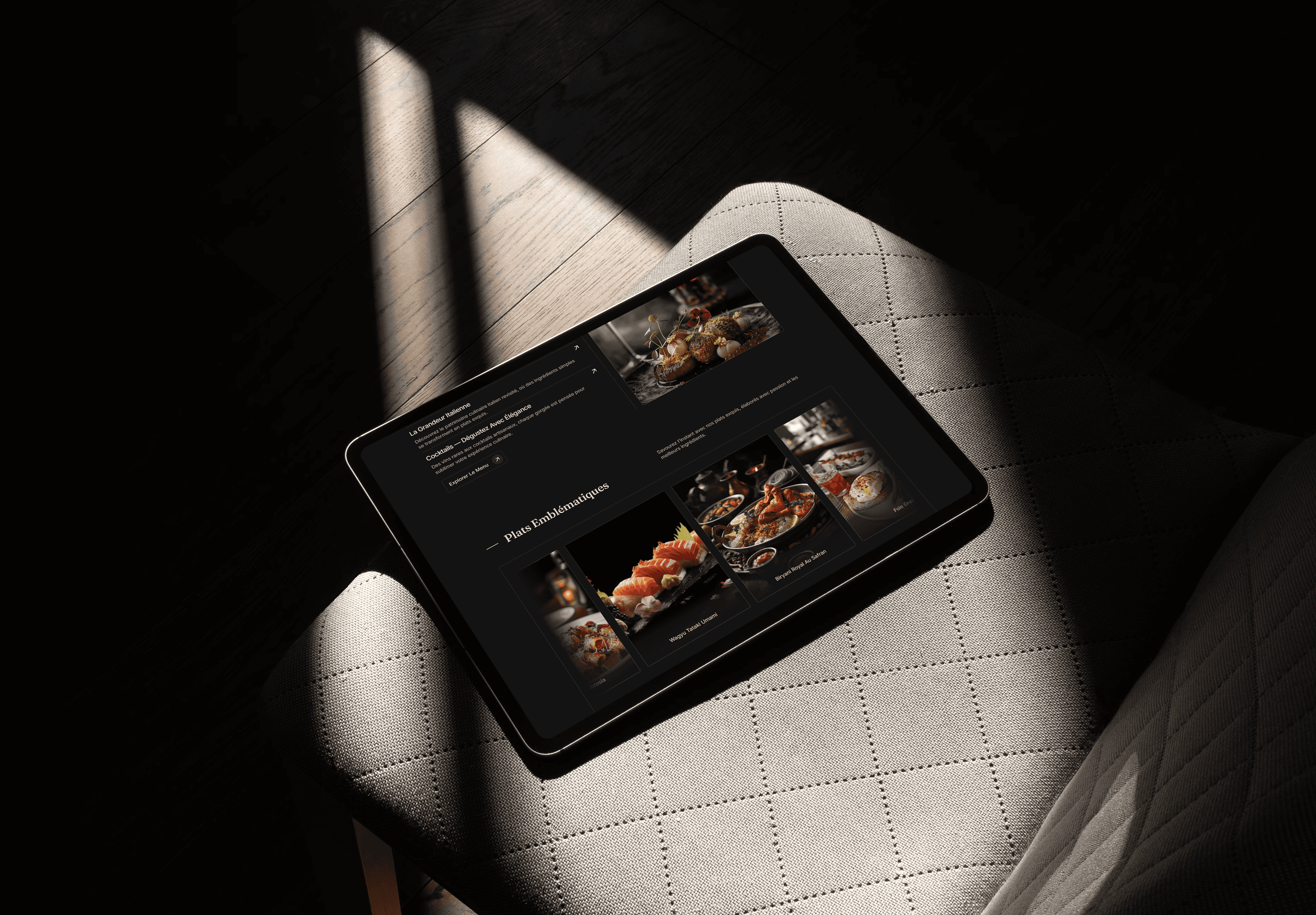 Design de la carte de visite : conception d’un support élégant, jouant sur les contrastes et les matériaux haut de gamme, pour transmettre l’image premium du restaurant dès le premier contact.